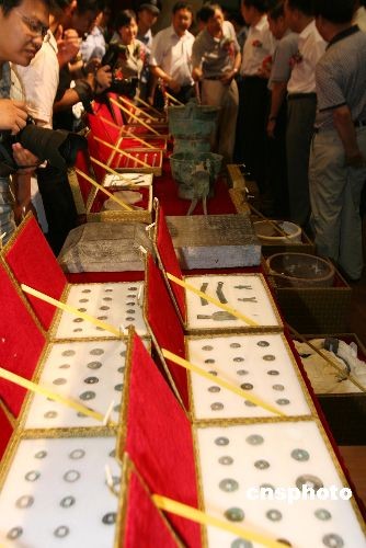 7月14日上午,河南省文物局和安陽市在河南博物院多功能廳舉行河南省征調(diào)文物入藏儀式,將河南博物院和河南省文物考古研究所收藏的193件有關(guān)文字的文物移交中國文字博物館收藏。這批移交的文物包括河南博物院藏“十六年鄭令”戈、銅“部曲將”印、曾子甗等123件文物和河南省文物考古研究所藏的賈湖龜腹甲刻符、新蔡葛陵楚墓竹簡、溫縣盟書、長子口鼎、、薳子昃鼎、平夜君成戈、垂球等不同歷史時期的各門類文物70件。中新社發(fā) 王中舉 攝