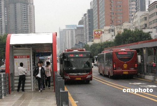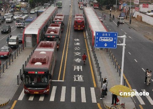 5月28日,新開(kāi)通的快速公交行駛在專(zhuān)用車(chē)道上。當(dāng)天,鄭州快速公交(BRT)線(xiàn)路開(kāi)通運(yùn)行。該線(xiàn)路由1條30公里的主線(xiàn)和8條支線(xiàn)組成,運(yùn)營(yíng)車(chē)輛共計(jì)220余臺(tái),設(shè)站臺(tái)38對(duì),平均站距800米,全程采用封閉式中央專(zhuān)用車(chē)道。鄭州快速公交首期建設(shè)項(xiàng)目不僅是全省開(kāi)通的首條快速公交線(xiàn)路,也是目前全國(guó)在城市中心環(huán)線(xiàn)上開(kāi)通的首條快速公交線(xiàn)路。中新社發(fā) 王中舉 攝