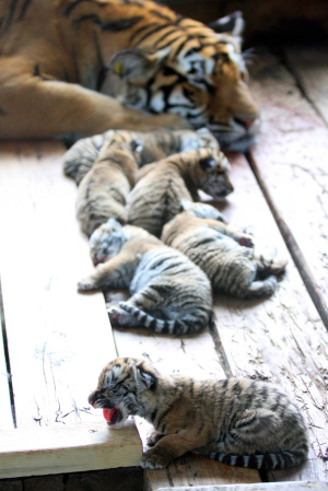 13時30分,當(dāng)記者來到黑龍江東北虎林園虎舍外時,編號為“H-01-204”的雌東北虎正在陪著兩雄四雌虎寶寶午睡,一些醒來的虎寶寶雖然還沒有睜開眼睛,但是已經(jīng)好奇地在虎媽媽身邊爬來爬去,虎媽媽則慈愛地用舌頭在虎寶寶身上舔著。