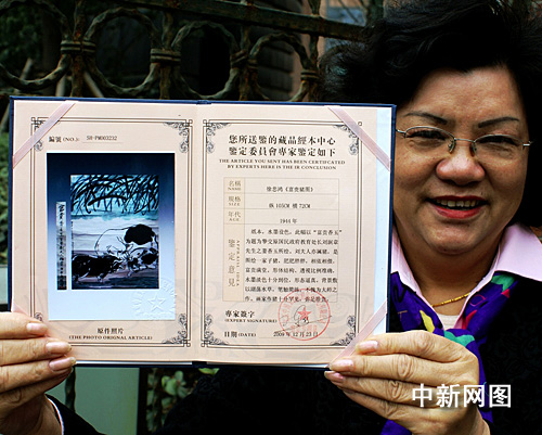 在2009年12月底,這幅畫送權威機構北京中博文物檢測鑒定中心鑒定,經資深文物鑒定專家陳行一先生鑒定,確認為徐悲鴻大師的真跡。陳行一在鑒定意見中還寫道:“劉夫人亦屬豬,是圖繪一家子豬,肥肥胖胖,相依相偎,富貴滿堂。形體結構、透視比例準確,水墨淡色十分到位,形態逼真。背景敷以湖蕩水草,筆觸簡練,不愧為大師之作。畫家作豬十分罕見,彌足珍貴!