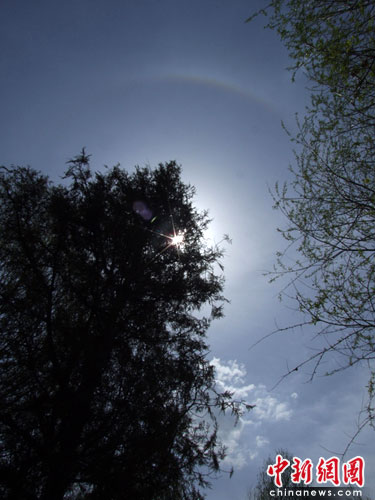 中新網5月23日電 (高峰毅 焦瑾琦) 近日,華北地區氣溫居高不下。5月21日晚9時許,山西五臺山出現了月暈現象,持續了近一個小時。而第二天,即22日上午9時許,五臺山上空又出現了日暈奇觀,,并持續了兩個多小時。這兩種暈的出現時間差不足12小時,著實令人稱奇。
