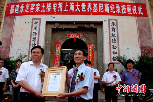 6月12日上午,上海大世界基尼斯總部在世界遺產永定“承啟樓”舉行授匾儀式。上海大世界基尼斯總部將“大世界基尼斯之最·擁有‘福建土樓’最多的縣——福建省永定縣”的匾牌授予永定縣,標志著永定客家土樓成為基尼斯記錄中的重要一員。 匾牌上銹刻著:該縣現存“福建土樓”23000座,遍布各個鄉鎮、村落,其中圈數最多、建筑規模最大的為“承啟樓”;最高的為“永隆昌樓”;最古老的為“龍安寨”(始建于唐朝)。 劉永良 攝