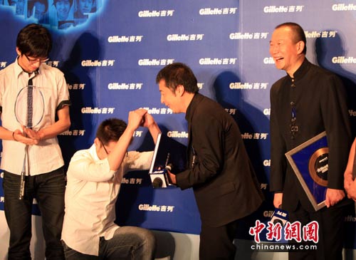 6月20日,第六代導(dǎo)演領(lǐng)軍人物賈樟柯(右二)攜手國(guó)際知名音樂人譚盾(右),在上海出席“吉列自信男人,為中國(guó)露臉”活動(dòng),現(xiàn)場(chǎng)一位80后“未來之星”,突然跪地,向賈樟柯拜師,著實(shí)讓與會(huì)者意外,但是,也讓現(xiàn)場(chǎng)嘉賓看到年輕人自信所在。