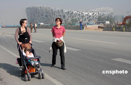 2007年10月21日,兩位外國女游客帶著孩子觀看“鳥巢”國家體育場。劉敬民代表19日在新聞發(fā)布會上說,除國家體育場因開幕式工程需要,在明年3月份竣工外,其他場館都將按計(jì)劃在年底完工。中新社發(fā) 吳芒子 攝