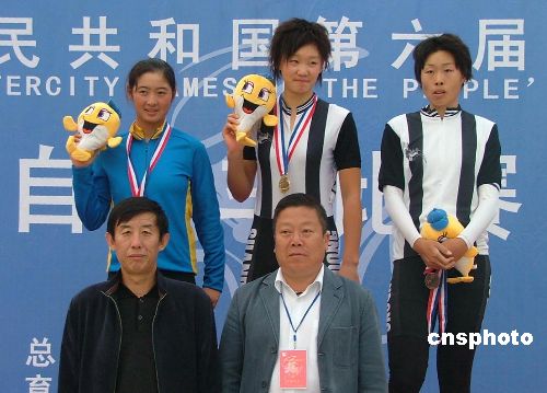 十月二十三日,第六屆城市運(yùn)動(dòng)會(huì)自行車(chē)場(chǎng)地賽在河南洛陽(yáng)新區(qū)體育中心開(kāi)賽,女子三公里個(gè)人追逐賽冠軍被煙臺(tái)市隊(duì)的姜帆(中)奪得,北京順義隊(duì)的王翠、煙臺(tái)隊(duì)的姜吻吻分獲二、三名。中新社發(fā) 史寶銀 攝