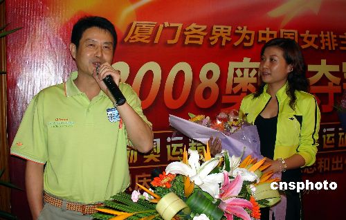 十月二十八日晚,在廈門各界“為中國女排主教練陳忠和二○○八奧運奪冠加油”酒會上,陳忠和表示,明年奧運會中國女排奪冠征途面臨六、七支勁敵,中國女排將迎難而上,奮力奪冠。中新社發 楊伏山 攝