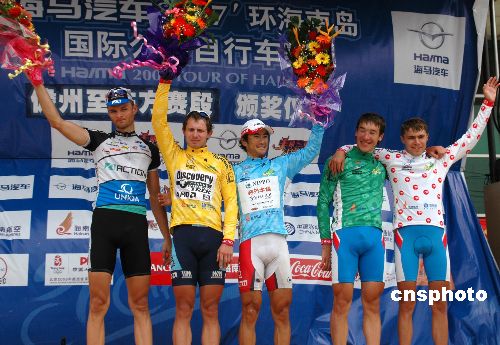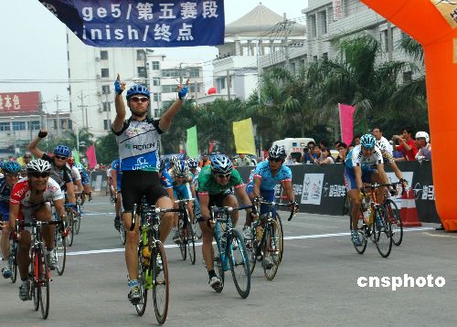 十一月八日,“海馬汽車”二00七環海南島國際公路自行車賽進行第五賽段儋州至東方一百六十八公里的比賽,波蘭隊四號車手羅伯特·仁多士(前左二)獲得本賽段冠軍。中新社發 尹海明 攝