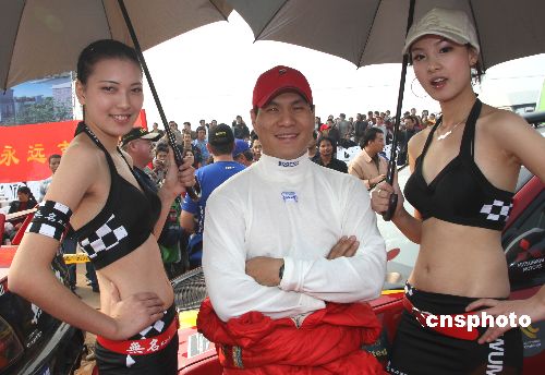 2007年國際汽聯亞太汽車拉力錦標賽11月9日在浙江龍游拉開戰幕,來自世界的眾多高手及中國的共計65部賽車參賽。圖為“中國第一車手”徐浪(中)新組建的“無名車隊”由美女相伴出戰。中新社發 趙振清 攝