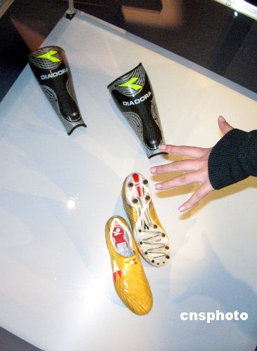 十一月十日,“2007米蘭設(shè)計制造展”在上海開幕,為意大利贏取2015年世博會主辦權(quán)造勢。意大利球星托蒂的“世界杯紀(jì)念球鞋”及蘊涵高科技的球員“護脛”隨這一展覽首次亮相上海。據(jù)介紹,這雙金色的足球鞋,是典型的米蘭設(shè)計風(fēng)格,使用金色袋鼠皮配合意大利國旗的三色標(biāo)志,鞋跟部的四顆星,象征意大利國家隊四度贏得問鼎世界杯。中新社發(fā) 許曉青 攝