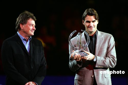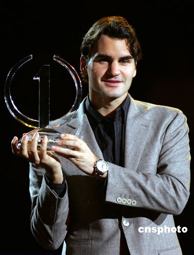 11月13日,ATP在上海舉行儀式,由ATP主席德維利爾斯先生親自將ATP年終世界第一的獎杯頒給費德勒,這也是費德勒自2004年之后連續(xù)第4年獲得年終世界第一。中新社發(fā) 湯彥俊 攝