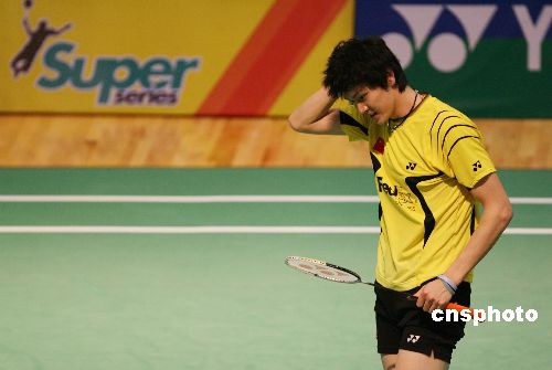 十一月二十九日,二零零七中國香港羽毛球超級賽進行正賽第二輪的比賽,男單三號種子選手鮑春來因為右腳腳踝有傷宣布放棄比賽。中新社發(fā) 武仲林 攝