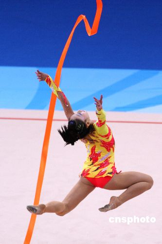 圖為中國選手丁一丹在進行繩操比賽,她晉級了明日的決賽。