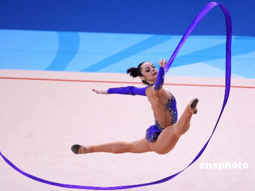 圖為希臘世錦賽上個人全能排名第一的烏克蘭選手安娜·別索諾娃在進行繩操項目的爭奪。