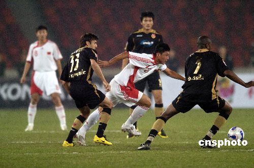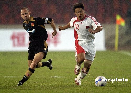 2007年12月18日晚,中國國奧隊與德甲科特布斯隊在佛山世紀蓮體育場交戰(zhàn),終場雙方1比1戰(zhàn)平。中新社發(fā) 吳峻 攝