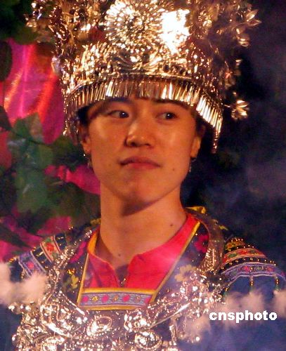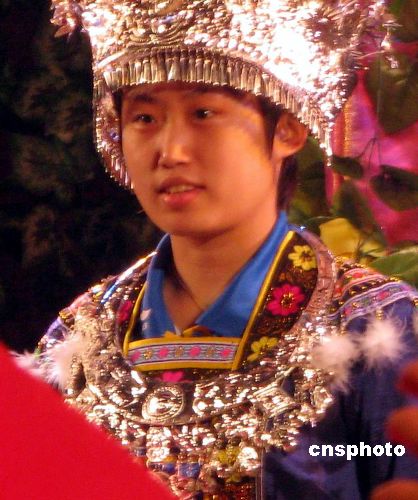 12月24日晚,2007年國際女子乒乓球對抗賽在廣西柳州拉開帷幕。賽前所有運動員都身穿當地的民族服裝亮相。中新社發 周瀟男 攝