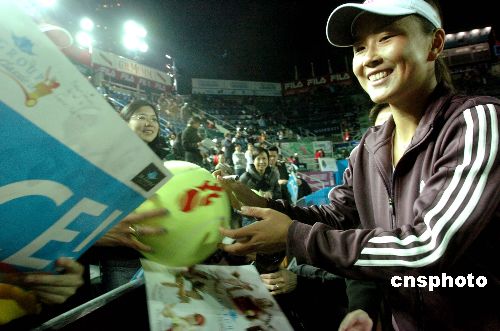 一月五日,彭帥在香港網球精英賽優秀組女子決賽中以二比一戰勝沃茲尼亞基,奪得冠軍。圖為彭帥賽后為觀眾簽名。中新社發 鄧慶樂 攝