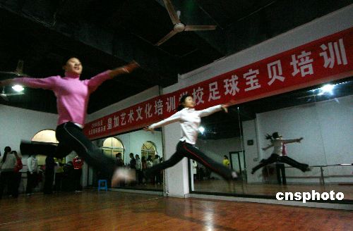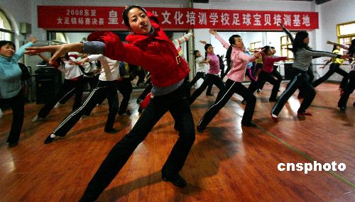 1月15日,東亞女足的“足球寶貝”們在訓練。2008年東亞女足錦標賽將于2月17日-24日在重慶市永川區體育中心舉行,永川區從該區大中院校選出42名“足球寶貝”,進行為期一個月的藝術體操、姿態等基本功訓練,屆時將以嶄新身姿展現在人們面前。中新社發 陳仕川 攝