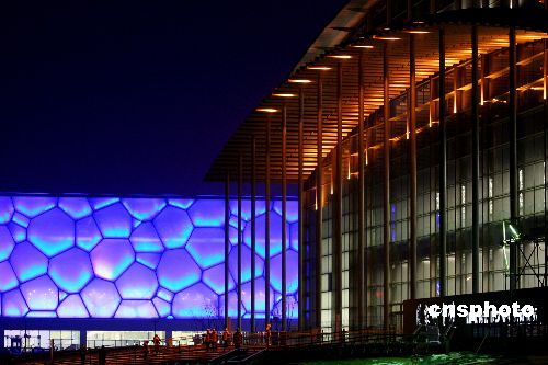 1月21日,北京奧林匹克公園內(nèi)的北京奧運會游泳館-水立方進行夜景燈光調(diào)試,迎接1月31日在這里舉行的“好運北京”中國游泳公開賽。中新社發(fā) 富田 攝