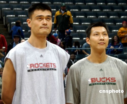 當?shù)貢r間二月二日,由姚明領軍的NBA休斯頓火箭隊作客密爾沃基,挑戰(zhàn)另一位中國球員易建聯(lián)所效力的雄鹿隊。此為火箭和雄鹿在本賽季的第二次交鋒。姚明(左)和易建聯(lián)(右)賽前互致問候并合影。中新社發(fā) 李靜 攝