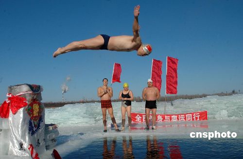 2月7日,黑龍江黑河市冬泳俱樂部與俄羅斯布拉戈維申斯克市冬泳俱樂部的30多名隊員,在黑河市中俄界江冒著零下30度的嚴寒,以冬泳方式歡度新春佳節。中新社發 邱齊龍 攝