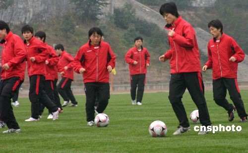 2月16日下午,朝鮮女足在永川備戰四國賽。當日,朝鮮女足主教練金光明帶領21名弟子出現在重慶財經職業學院足球訓練場進行首場集訓。據了解,奪冠呼聲高的朝鮮女足15日晚7時多抵達下塌的永川名豪國際酒店,她們是最后一支抵達永川的球隊。2008東亞女足錦標賽決賽將于2月18日在永川體育中心開賽。中新社發 陳仕川 攝