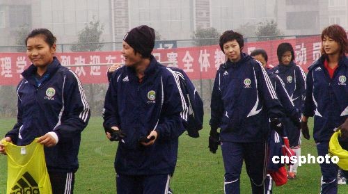 2月17日上午,中國女足在主教練伊麗莎白帶領下,在重慶文理學院足球訓練場冒著春雨進行“靈敏度”訓練及5打5的分組對抗訓練。中新社發 陳仕川 攝