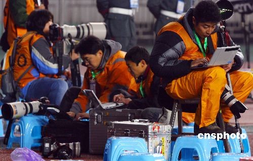 2月17日,2008東亞足球錦標賽揭幕戰(zhàn)在中國重慶打響。揭幕戰(zhàn)中,中國隊未能打破“恐韓”魔咒,以2:3惜敗于韓國,日本則與朝鮮隊1:1戰(zhàn)平,中國隊排名暫時位居末位。圖為球賽中場休息時,記者們在場邊爭分奪秒發(fā)稿。中新社發(fā) 郭晉嘉 攝