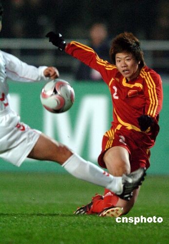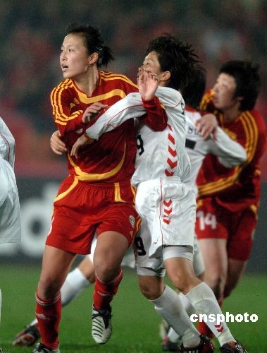 2008年2月21日晚,東亞女子足球錦標(biāo)賽第二輪在重慶永川體育中心體育場進行。終場中國隊在少一人的情況下以0比0戰(zhàn)平朝鮮隊。中新社發(fā) 吳峻 攝