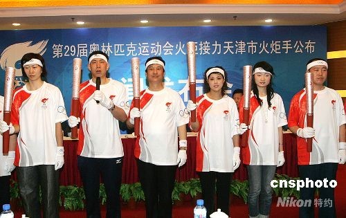 4月30日,北京第29屆奧林匹克運動會火炬接力天津市火炬手名單公布。全國勞動模范孔祥瑞(左三),當代著名作家和畫家馮驥才,天津女排主教練王寶泉,奧運會排球冠軍張娜、李珊等入選。將參加天津地區火炬接力的共有416名火炬手和85名護跑手,年齡最大的七十九歲,最小的十四歲。中新社發 孫震 攝