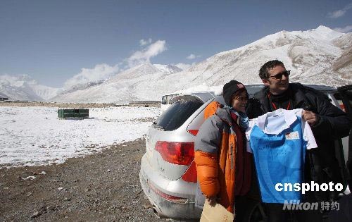 5月4日,由于身體原因,采訪北京奧運(yùn)火炬接力珠峰傳遞活動(dòng)的德國(guó)記者約克,不得不撤離珠峰大本營(yíng)新聞中心,退出此次采訪活動(dòng)返回德國(guó)。圖為約克(右)撤離前接受北京奧組委工作人員贈(zèng)送的簽名襯衫。 中新社發(fā) 盛佳鵬 攝