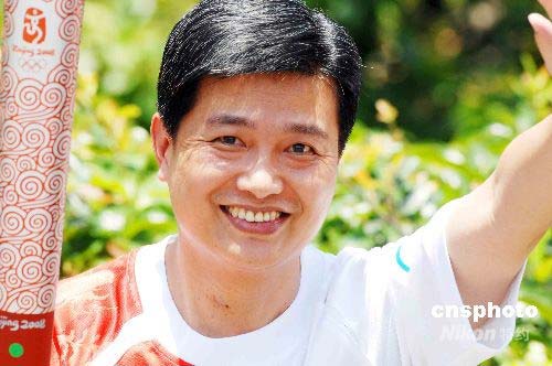 5月8日中午,奧運火炬接力傳遞在深圳舉行,社會各界208名火炬手穿越深圳。圖為深圳第一位打破世界紀錄的運動員韓星元在第四棒火炬傳遞中。中新社發 陳文 攝