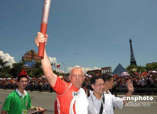5月8日,奧運圣火在深圳進行傳遞。在深圳世界之窗門前芬蘭籍火炬手芬蘭前奧委會主任塔帕尼·愛爾卡同深圳市民同樂祥云火炬。中新社發 廖攀 攝