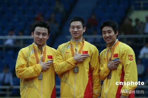 5月9日,2008年全國體操錦標賽暨奧運選拔賽男子全能決賽頒獎儀式在天津體育中心舉行。楊威(中)以96.900分奪得男子全能金牌,馮喆、滕海濱分獲第二、第三名。中新社發 田齊 攝
