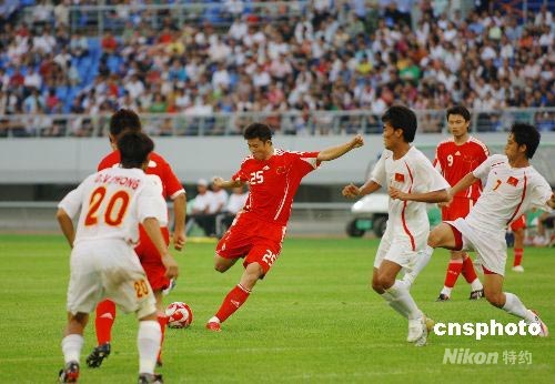 7月6日晚,中國國奧隊在沈陽奧體中心體育場與越南國家隊進行了一場友誼賽。最終國奧隊以3:2戰勝越南國家隊。中新社發 zhangpeng0720 攝
