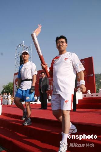 7月7日,北京奧運(yùn)火炬在蘭州進(jìn)行傳遞,第一棒火炬手是抗震救災(zāi)英雄田宇。田宇是甘肅省隴南市徽縣嘉陵鎮(zhèn)政府武裝部部長(zhǎng),在“5·12”地震中,他帶領(lǐng)民兵搶救出8名受困群眾。 中新社發(fā) 周兆軍 攝