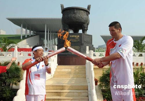 7月8日,奧運火炬在內(nèi)蒙古呼和浩特市進行傳遞,曾在美國參加NBA聯(lián)賽并獲得過總冠軍的中國著名蒙古族籃球中鋒巴特爾傳遞首棒火炬。 圖為巴特爾在民族團結(jié)鼎前和湯愛軍交接奧運火炬。中新社發(fā) 廖攀 攝