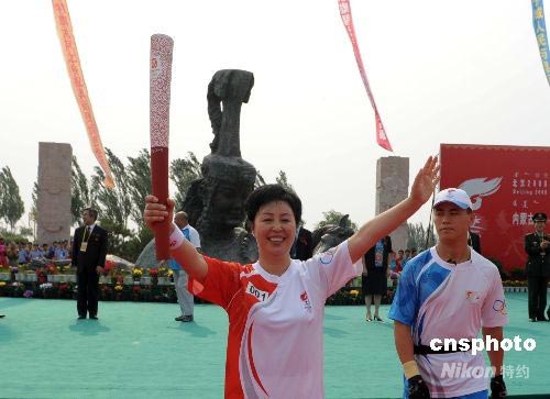 7月10日,奧運火炬開始在著名的紅山文化起源地內蒙古赤峰市進行傳遞。傳遞線路全長6.1公里,起點為車伯爾民俗園。第一棒火炬手為赤峰第一任旅游局局長、全國旅游系統先進個人娜日蘇。 中新社發 廖攀 攝