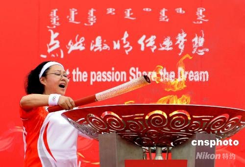 7月10日,奧運火炬在內蒙古赤峰傳遞。赤峰末棒奧運火炬手中國著名演員斯琴高娃在玉龍廣場點燃圣火盆,奧運火炬在內蒙古進行的傳遞結束。 中新社發 廖攀 攝