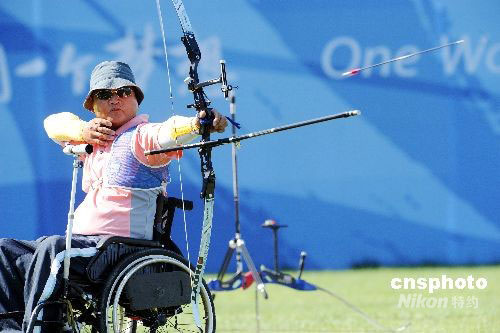 9月12日,在北京2008年殘奧會射箭男子個人反曲弓-坐姿1級/坐姿2級1/4決賽中,中華臺北選手曾隆輝以105比105與韓國選手李洪求戰平,在加賽中又以2環的優勢獲勝,進入前四名。 中新社發 CNAsports_p 攝