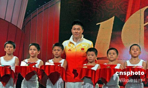 9月25日,湖南省人民政府授予李小鵬湖南功勛運動員稱號,授予其教練陳雄功勛教練員稱號。李小鵬在當晚舉行的《為奧運湘軍喝彩》的頒獎晚會上第一次與自己的十六枚獎牌團聚,其中的一枚獎牌曾為四川地震災(zāi)區(qū)籌集賑災(zāi)款而拍賣。中新社發(fā) 張家根 攝
