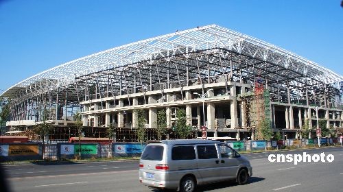 2008年11月8日,沈陽奧體中心綜合體育館已現形。該館可容納8000名觀眾,可滿足羽毛球、乒乓球、體操、拳擊等賽事對場館的要求,還可舉辦大型音樂會、演唱會。沈陽奧體中心建筑群“一場三館”,由奧體中心一座體育場、一座綜合體育館、一座游泳館和一座網球館組成。中新社發 劉寶成 攝