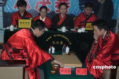 11月19日,“永城杯”第二十一屆中國圍棋名人戰五番棋決賽第四局較量在河南省永城市進行,古力九段在“福地”又下一城,執黑289手中盤擊敗樸文堯五段,將總比分扳成2比2平,衛冕冠軍的希望大增。圖為樸文堯(左)與古力在對局中。中新社發 沈晨 攝