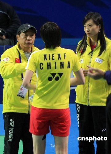 11月19日,在上海舉行的2008年中國羽毛球公開賽展開正賽首輪爭奪,中國羽壇老將、北京奧運會女單冠軍張寧(圖右),上任國家隊女單教練后首次亮相賽場督戰,格外引人關注。中新社發 湯彥俊 攝