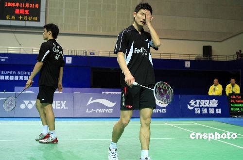 11月21日,在上海進行的2008年中國羽毛球公開賽男雙1/4決賽中,中國頭號男雙組合蔡赟/傅海峰以1比2不敵跨國組合陳甲亮/吳俊明無緣四強,三局的比分為17比21、21比19和21比18。中新社發 湯彥俊 攝