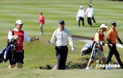 11月29日,歐米茄觀瀾湖世界杯高爾夫比賽進入第三天,中國球手張連偉、梁文沖在第三輪的四人四球賽中發(fā)揮神勇,第三輪打出-8的好成績。中新社發(fā) 陳文 攝