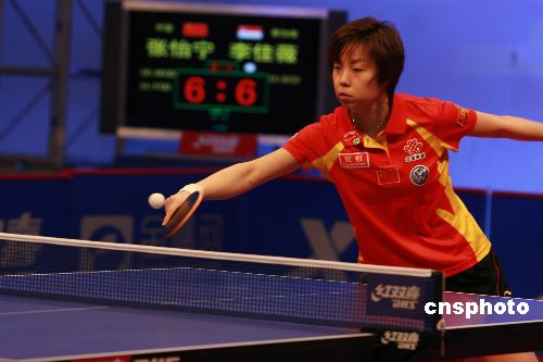1月11日,在長沙舉行的第三屆“世界乒乓球總冠軍賽”女單半決賽中,中國選手張怡寧、李曉霞分別戰勝對手晉級決賽。中國女單提前攬獲了本次總冠軍賽女單冠、亞軍。中新社發 鄧霞 攝