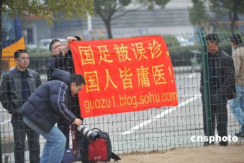 1月21日,國足將在杭州黃龍體育中心應戰亞洲杯預選賽的第二個對手越南隊。今天,國足來到體育場開始簡單熱身。現場球迷拉起橫幅“國足被誤診 國人皆庸醫”,國足隊員先后步入球場,執著的球迷依然撐著橫幅,站在場外。 中新社發 陳穎 攝