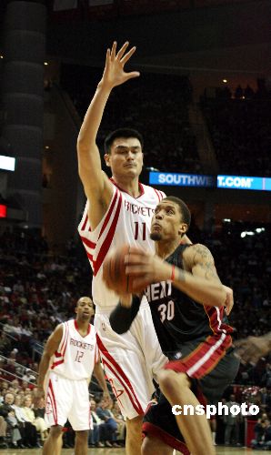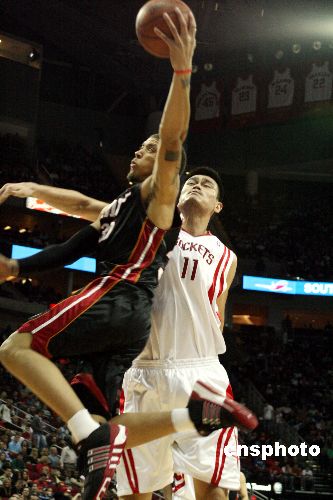 當地時間1月17日晚,主場作戰的火箭以93比86戰勝熱火,姚明全場十二投全中創個人進攻記錄。中新社發 歐文 攝