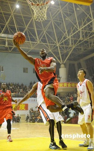 2月6日,2008—2009賽季CBA聯賽常規賽第32輪在山東臨沂的一場比賽中,山東黃金隊主場106:103戰勝山西中宇隊。中新社發 張侃 攝