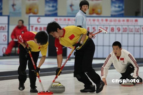 2月26日14時,哈爾濱,大冬會男子冰壺銅牌爭奪戰(zhàn)在黑龍江滑冰館進行,中國隊迎戰(zhàn)韓國隊。經(jīng)過二個半小時的較量,最終中國隊以9:5戰(zhàn)勝韓國隊,獲得銅牌。中新社發(fā) 王忠言 攝
